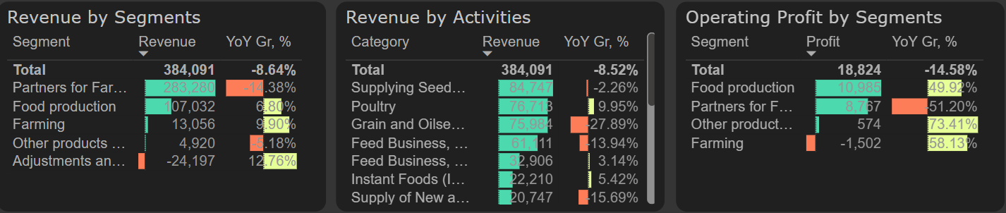 Revenue experienced a 9% YoY decline, mainly influenced by challenges in the partners for farmers segment. This segment saw a significant negative impact from a €29 million (28% YoY) drop in revenue from grains and oilseeds. The decline was driven by a 13% YoY reduction in grains and oilseeds sales volume and lower wheat prices compared to the previous year.