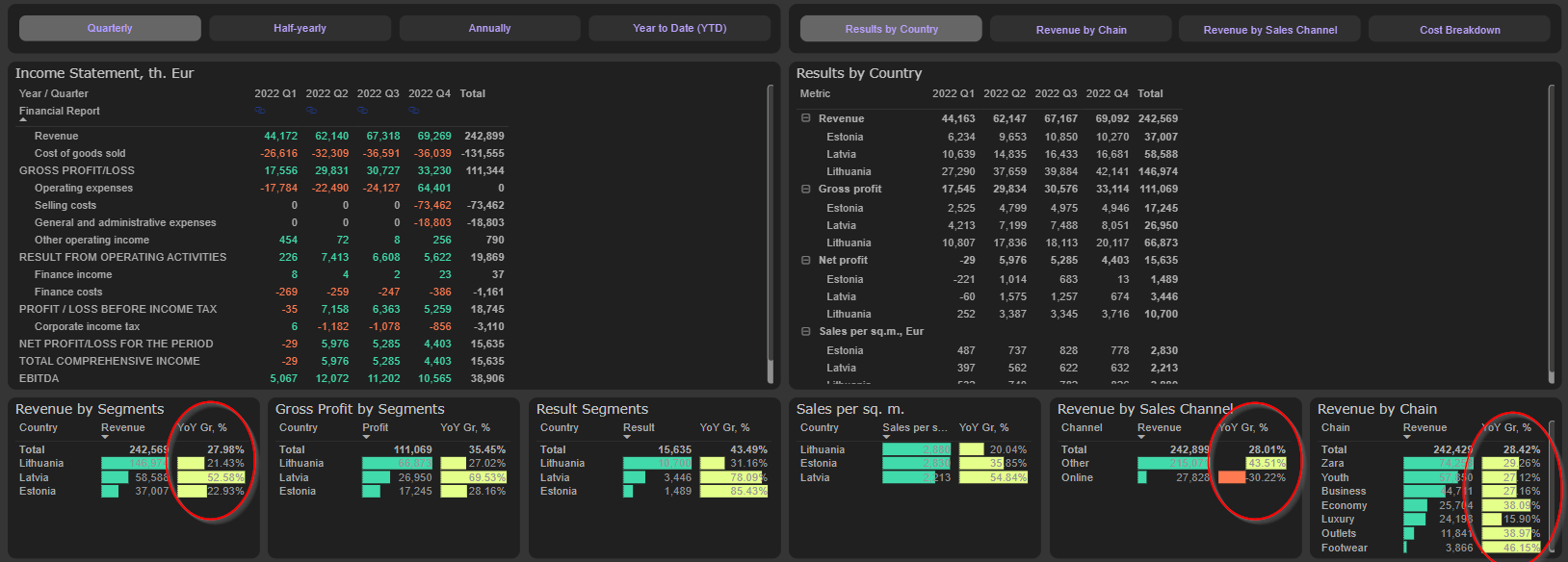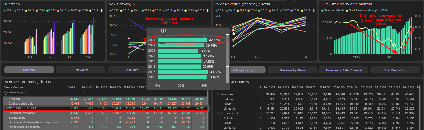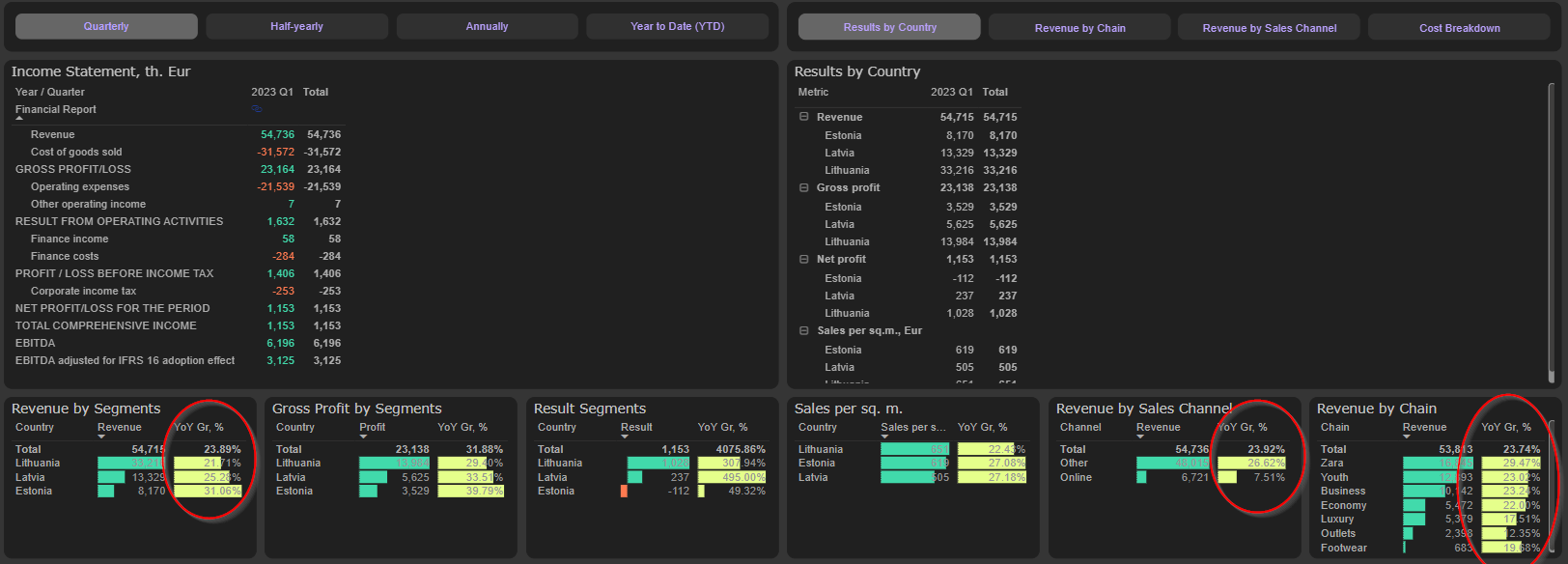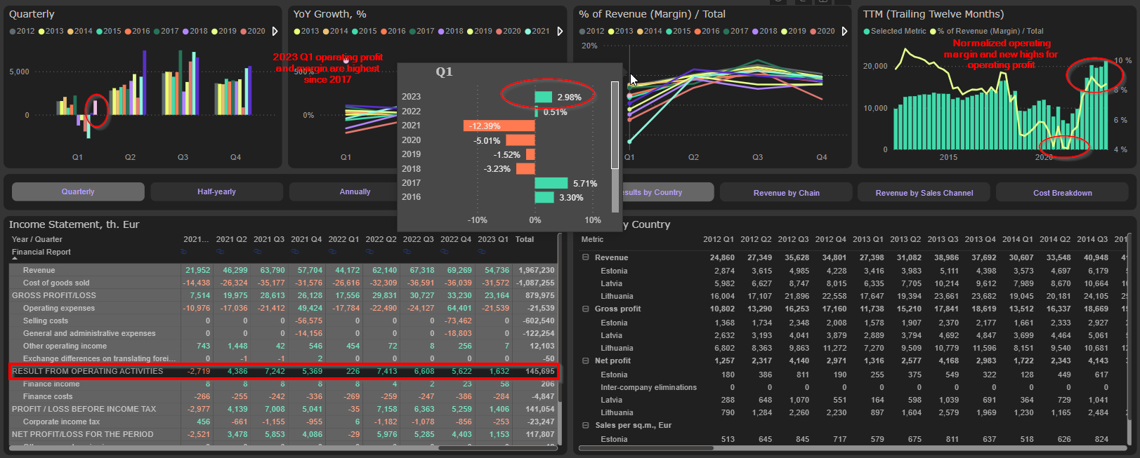 2023 Q1 revenue growth was driven mostly by Group’s “flagship” Zara as well as Youth, Business and Economy chains. Latvian and Estonian markets grew slightly faster than Lithuanian, although growth is very healthy in all countries. The structure of main growth drivers was essentially the same in 2022.