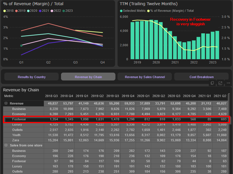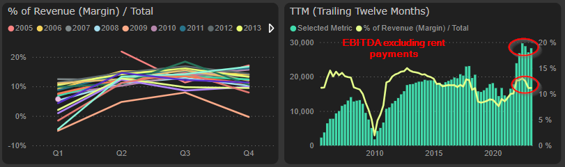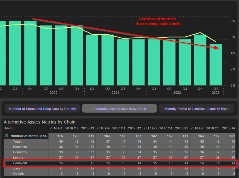 TTM revenue of all Group’s chains are exceeding their pre-COVID level, except of Footwear. Recovery of Footwear is very sluggish. Number of stores is continuously decreasing, annual revenue per store is only 396K Eur and lower than in 2019. It seems that Footwear may face “extinction” destiny, as it was in Tallinna Kaubamaja two years ago (Tallinna Kaubamaja "merged" its Footwear segment into Departmen store segment in 2021):