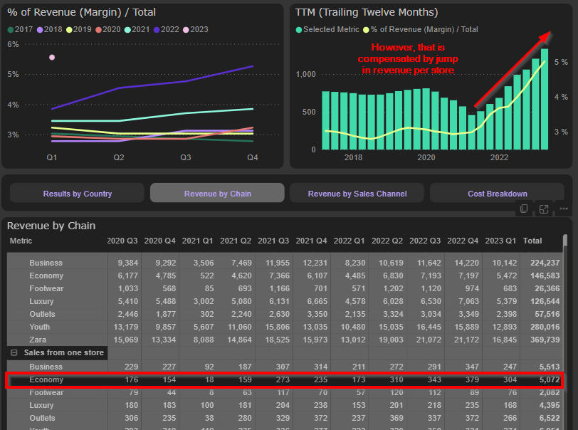 Excluding online revenue, average TTM sales per square meter are about 2.474 Eur. Strategically, there is a lot of room to go. E.g., Inditex global sales per square meter (excluding online) are about 5.300 Eur. H&M is not disclosing its total retail space, so calculations of its sales per square meter are somewhat complicated. However, its average annual sales per store are about 30% lower compared to Inditex - 3,1M Eur vs 4,6M Eur of Inditex (btw, Group’s average TTM sales per store are 1,35M Eur). It would be reasonable to assume, that H&M average sales per square meter also are about 30% lower compared to Inditex, amounting to approximately 3.700 Eur. That leaves also a lot of space for growth.