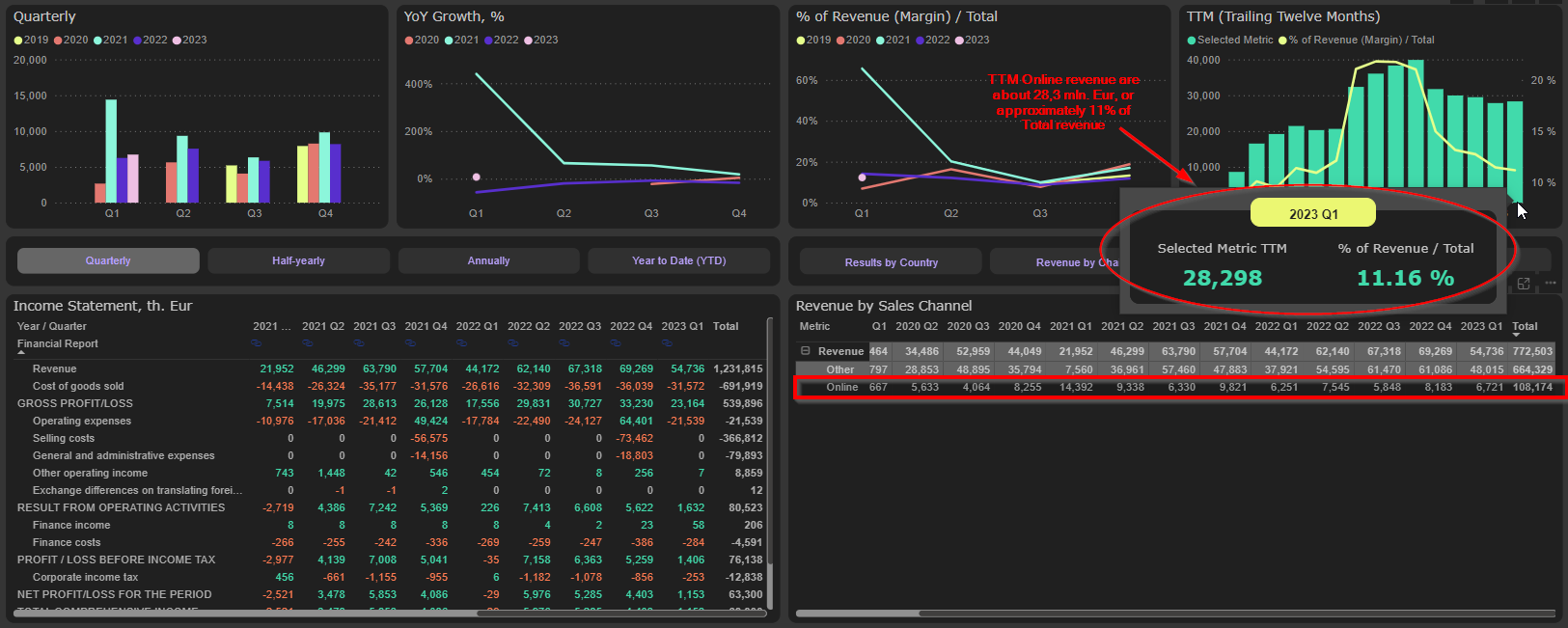 2023 Q1 TTM sales per square meter reached 3.000 Eur in Lithuania, 2.962 Eur in Estonia and 2.321 Eur in Latvia. These numbers, however, are impacted by Group’s online revenue, which comprised about 11% of total sales (decrease from ~21% in 2021):