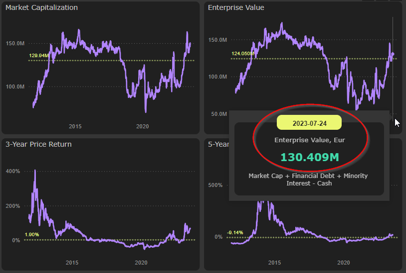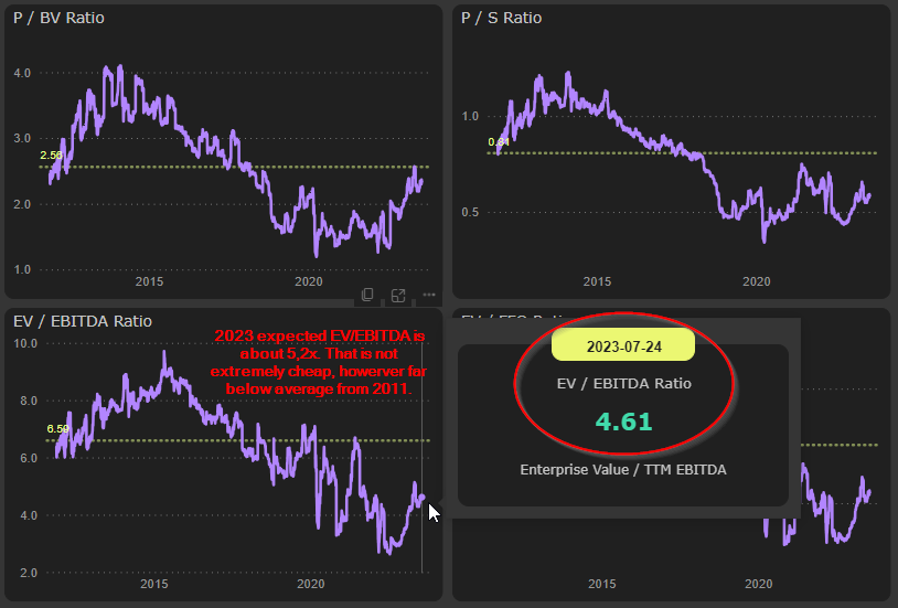 Current Enterprise value (excluding lease liabilities) is about 130M Eur. With 25M Eur expected EBITDA that gives us 5,2x EV/EBITDA. Of course, that is far from extreme bargain levels of 2022, but still looks very attractive in the context of historical valuation as well as peers and market: