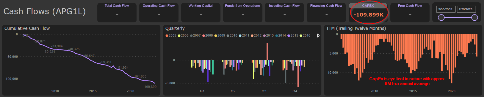 Capital Expenditures (CapEx) are cyclical in nature and averages to about 6M per year. Maintenance (replacement) CapEx, required to maintain stable fixed assets base, is about 5,8M year. For our free cash flow estimations we assume 5,8M of annual CapEx:
