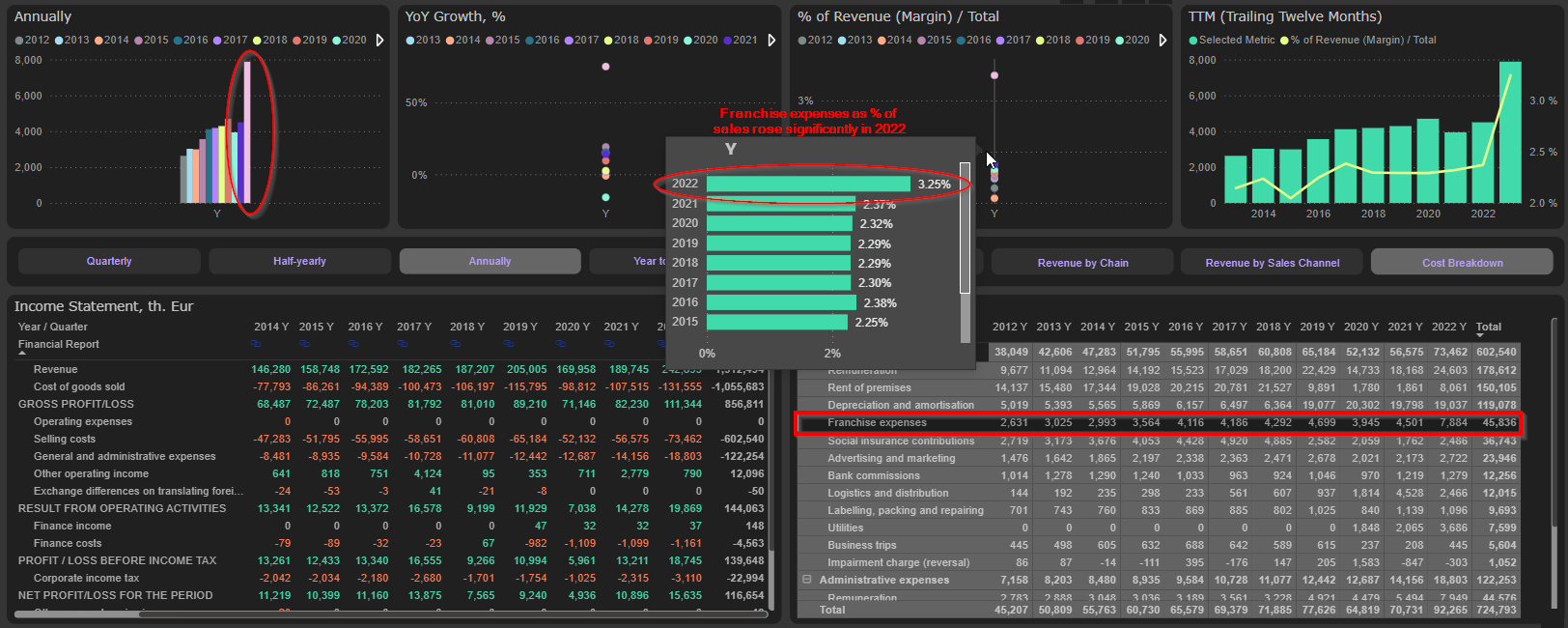 Business model risks. 43,9K sq. m. (48%) of Group’s total retail space are committed to brands under franchise agreement with Inditex. In terms of revenue it is, probably, significantly more, because only Zara accounts for 31% of total revenue (+ Bershka, Pull and Bear, Stradivarius, Massimo Dutti, Zara home and Oysho brands, which are not excluded to separate segments to identify precise amount of sales). Apranga Group renewed its agreement with Inditex (7th time) in March 2022 for two years (till 2024). Considering long history of cooperation between Group and Inditex, the risk of not renewing the agreement 8th and subsequent times is very remote, though not non-existent. Moreover, Apranga Group has issued to Inditex the call options to acquire lease rights for Zara, Bershka, Pull and Bear, Stradivarius, Massimo Dutti, Zara home and Oysho stores. Group’s management believes that these options will not be exercised (as it was in the past). However, again, the risk is not non-existent. Finally, even the extension of cooperation does not immune the Group from Inditex pricing risk. E.g., in 2022 franchise fee rose significantly – from average 2,3% of revenue to 3,25% of revenue: