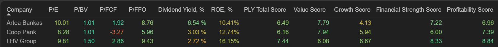 By market valution metrics, Artea Bank does not stand out: its P/E is higher than that of Estonian banks, and its ROE is the lowest. Artea's P/BV is similar to Coop Pank and lower than LHV Group, but LHV Group justifies its premium with significantly stronger ROE.
