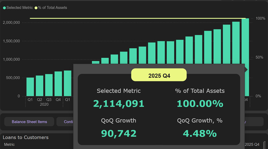 Coop Pank's loan portfolio growth rate in 2025 was very similar to LHV Group's, reaching 19%. During 2025, the loan portfolio increased by €340M, reaching €2.11bn at the end of the year.