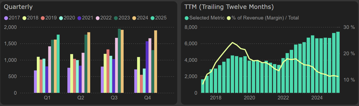 Nevertheless, gross profit still grew significantly – by 18.8% compared to the same quarter in 2024. However, operating expenses (sales and administrative) increased by 22% YoY, resulting in a more modest net profit growth of 9.3% YoY. The annual net profit remained at a record level of €7.4M.