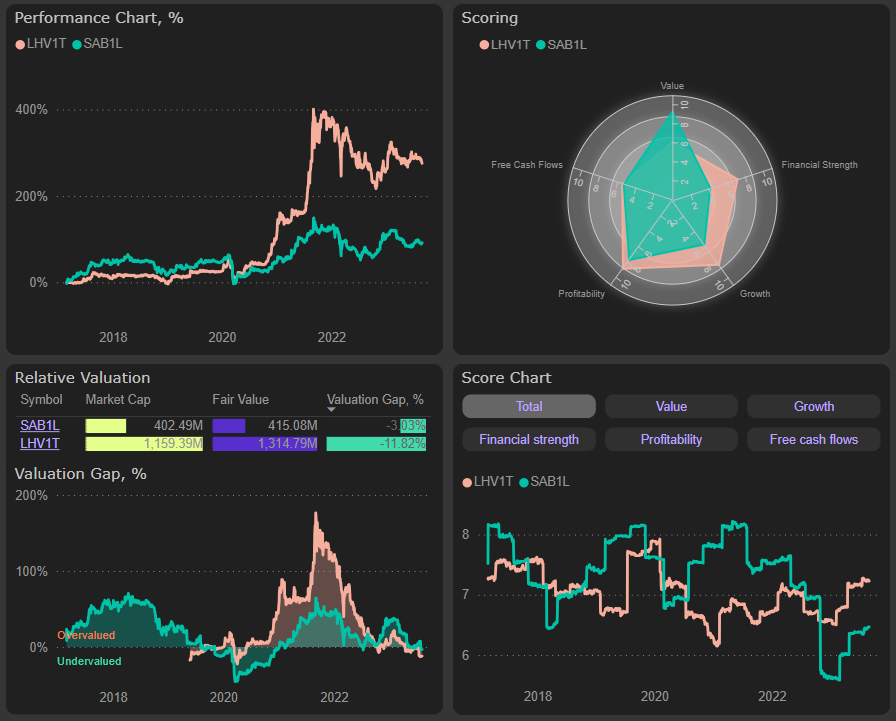 First of all, you can select multiple companies and easily compare them by any metric you wish. Press the “Ctrl” key and select the companies you wish to compare. Our market dashboard allows to evaluate and compare companies quickly by their Scores, assigned by our Scoring algorithm, and Valuation gap: