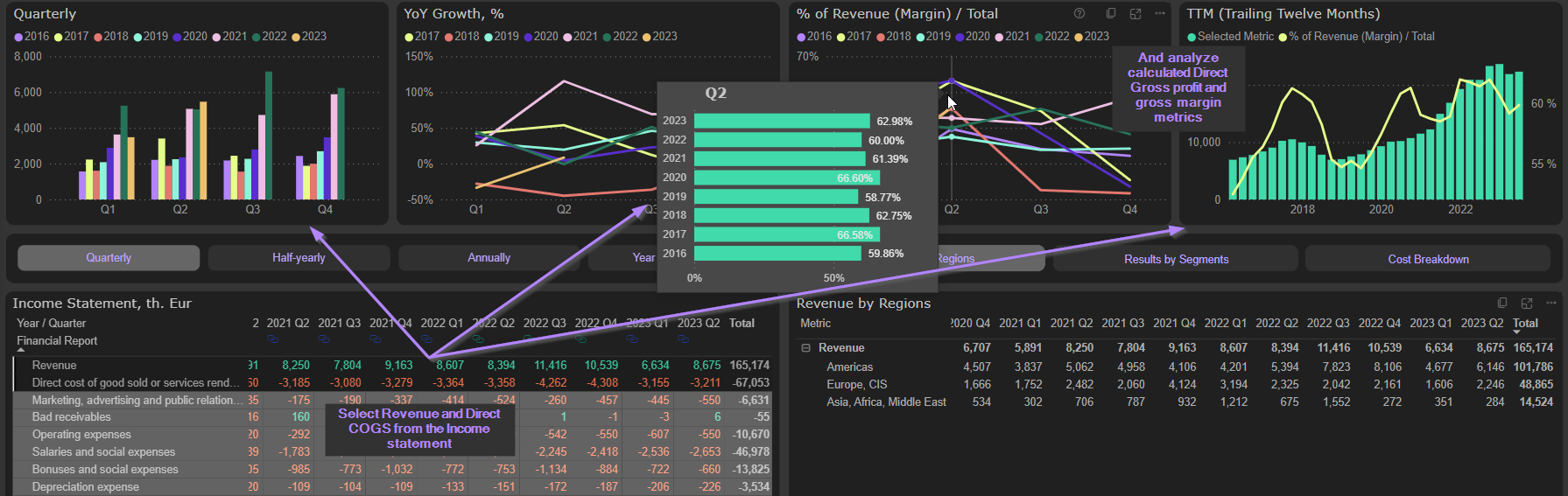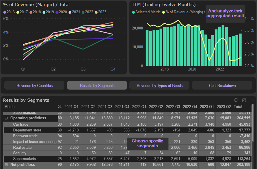 In every table of Profitability, Segments and KPIs analytics you can select multiples items with “Ctrl” key. That will add these items together and show the total in the charts above. E.g., you can select Revenue and Direct cost of goods sold items from the Income statement and see the automatically calculated total as a Direct gross profit category, even if the company didn’t provide it: