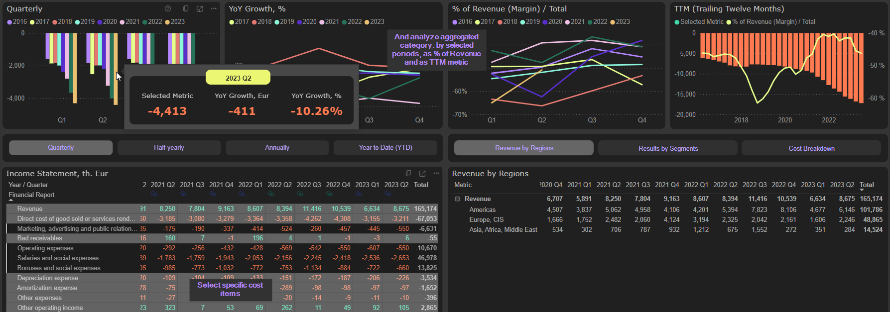 Or you can select several items of expenses from the Income statement and analyze the dynamic of this total category, including Quarterly / Half-yearly / Annually / YTD numbers, YoY growth, relation to Revenue and TTM metric: