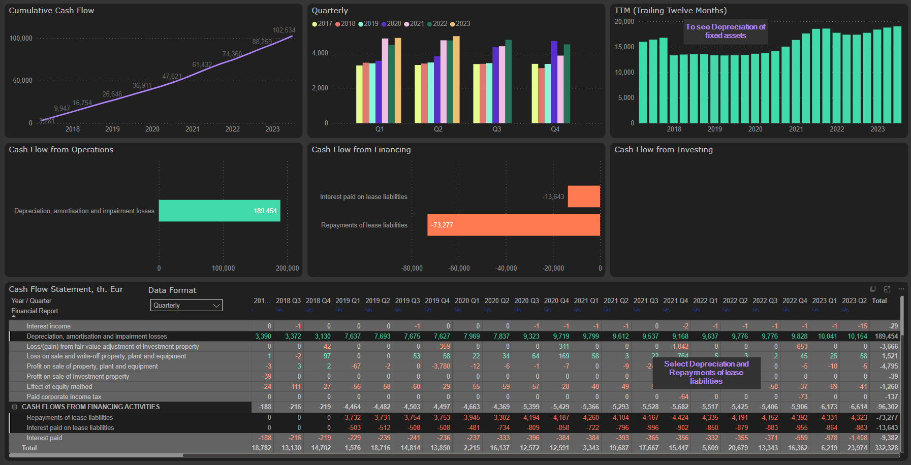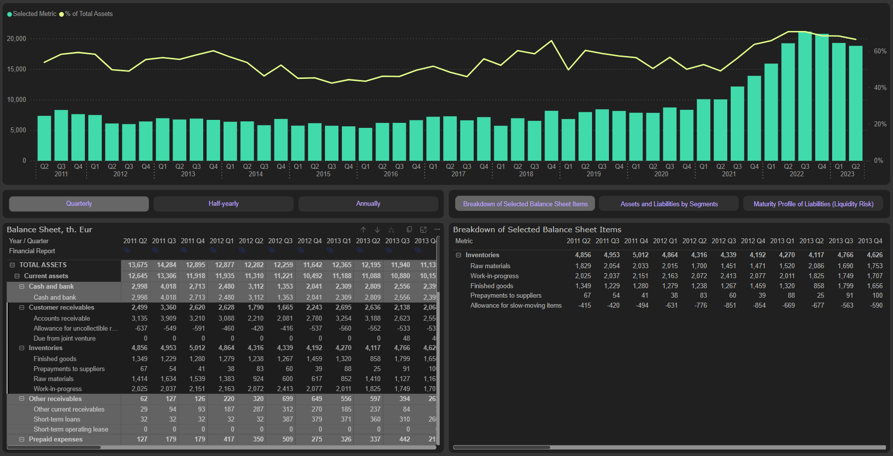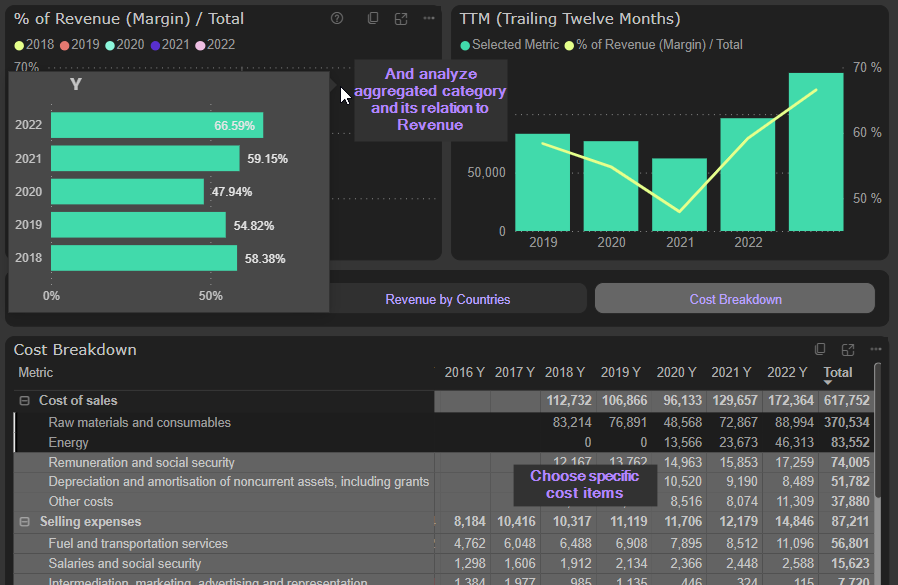 You can significantly increase the efficiency of your analysis by using multiple selection functionality of our dashboards. View profitability, balance sheet and cash flow metrics from completely new angles and with additional dimensions.
