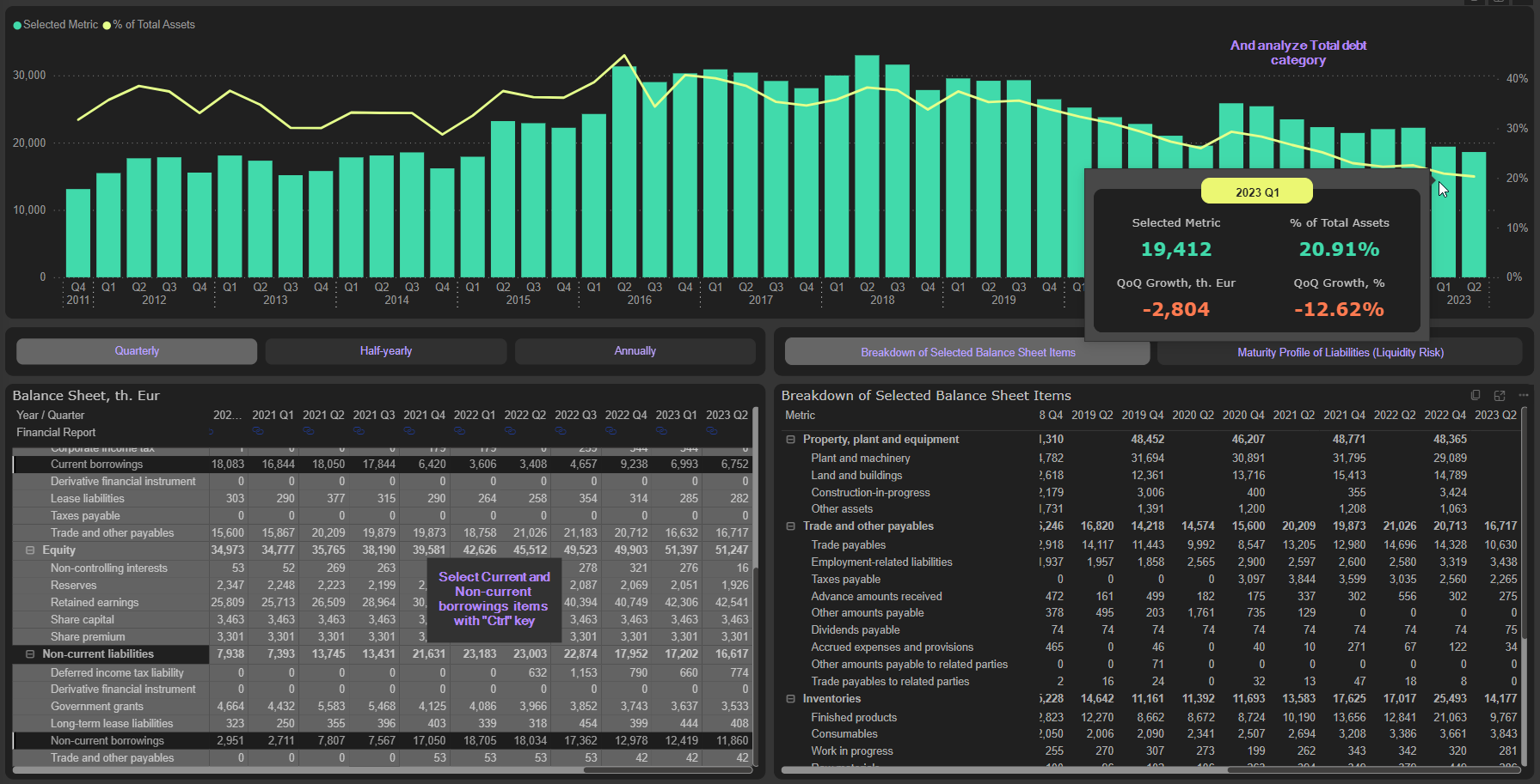 Multiple selection of Balance sheet items with “Ctrl” key allows to add them together and analyze total category graphically. E.g., selecting of Current and Non-current debt items from the Balance sheet allows to add these items together and analyze the dynamic of Total debt: