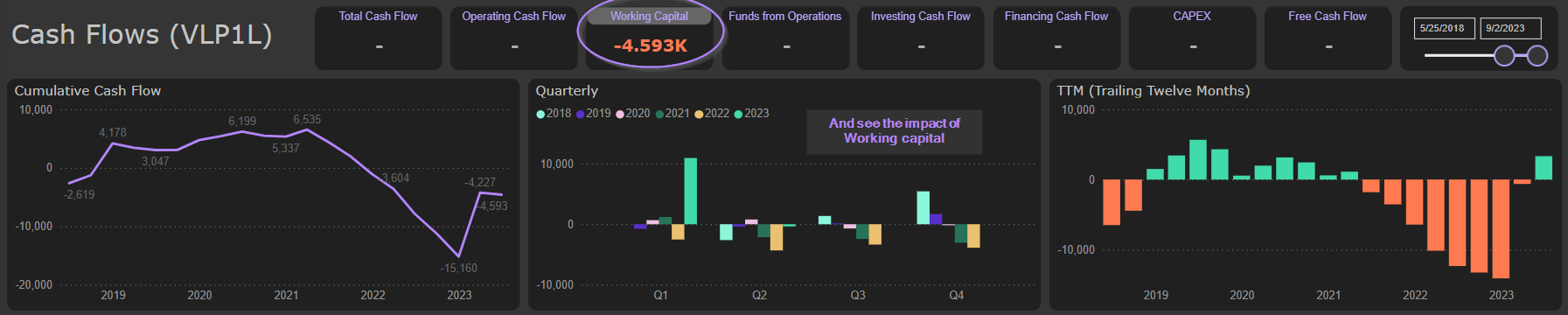 You can also add together as many cash flow items as you wish to see and analyze the result. E.g., select specific items from Working capital and see their impact on cash flow: