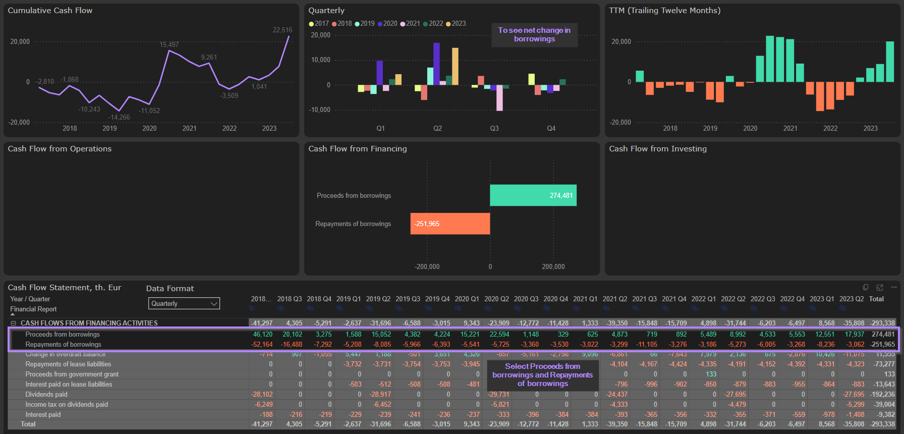 Or select proceeds from borrowings and repayments of borrowings to see net change in borrowings: