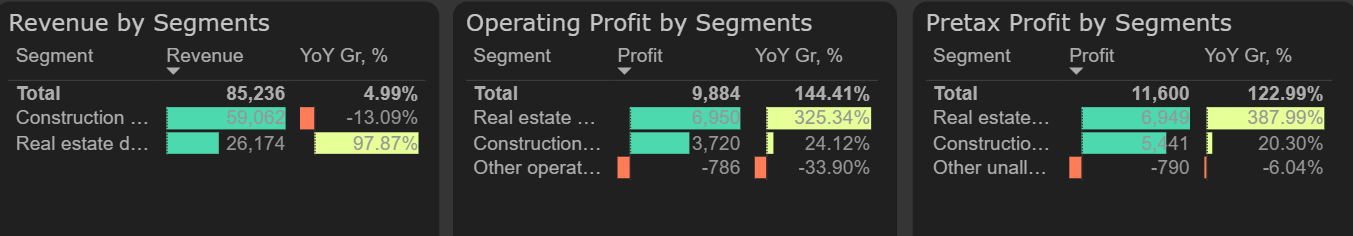 The company’s profit recorded significantly stronger growth than revenue – operating profit increased 2.4 times compared to the first quarter of 2024. The main source of this growth was the real estate segment, which, in terms of absolute operating profit, even surpassed the construction segment.
