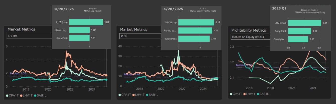 Compared to Estonian banks, Šiaulių bankas still does not stand out as exceptionally attractive. Coop Pank shows slightly lower valuation metrics (P/E, P/BV) and higher ROE. LHV Group continues to have a clear advantage over Šiaulių bankas in terms of ROE, which justifies its trading premium.