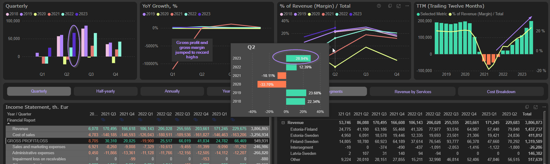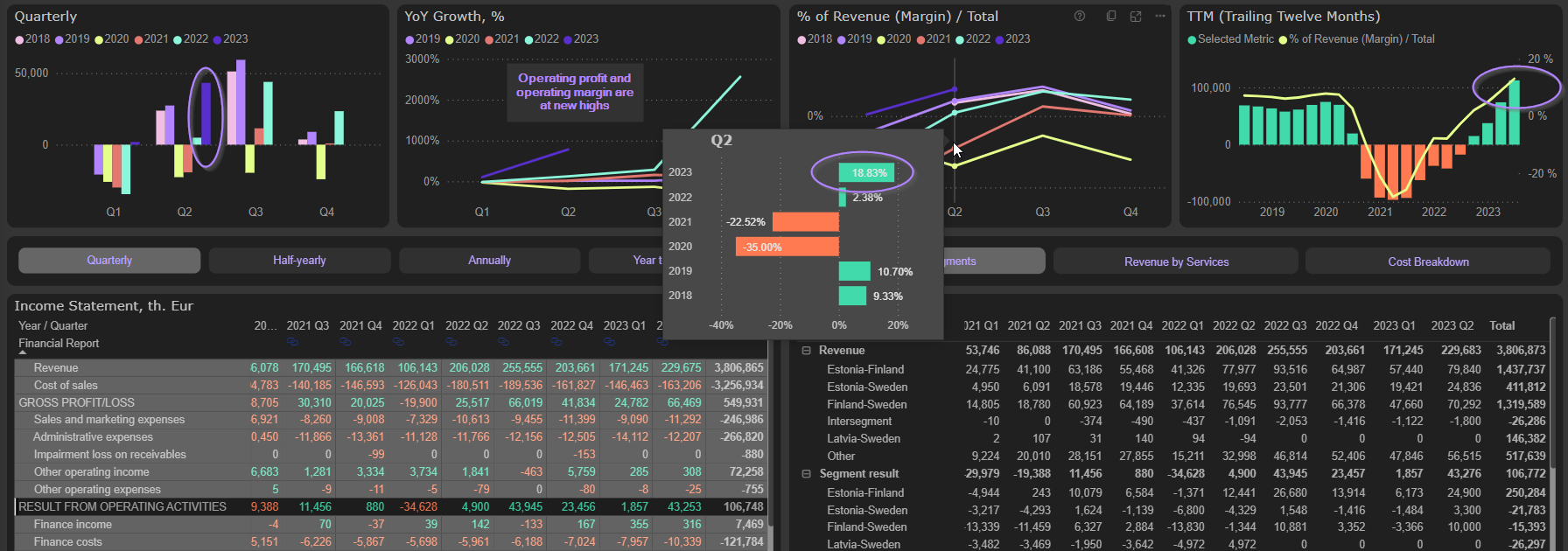 Strong gross margin and lower OpEx drove Operating profit and margin to new highs. 2023 Q2 Operating profit jumped to 43,3M Eur (58% above pre-COVID level), operating margin – to 18,8%. TTM operating margin improved to 13%: