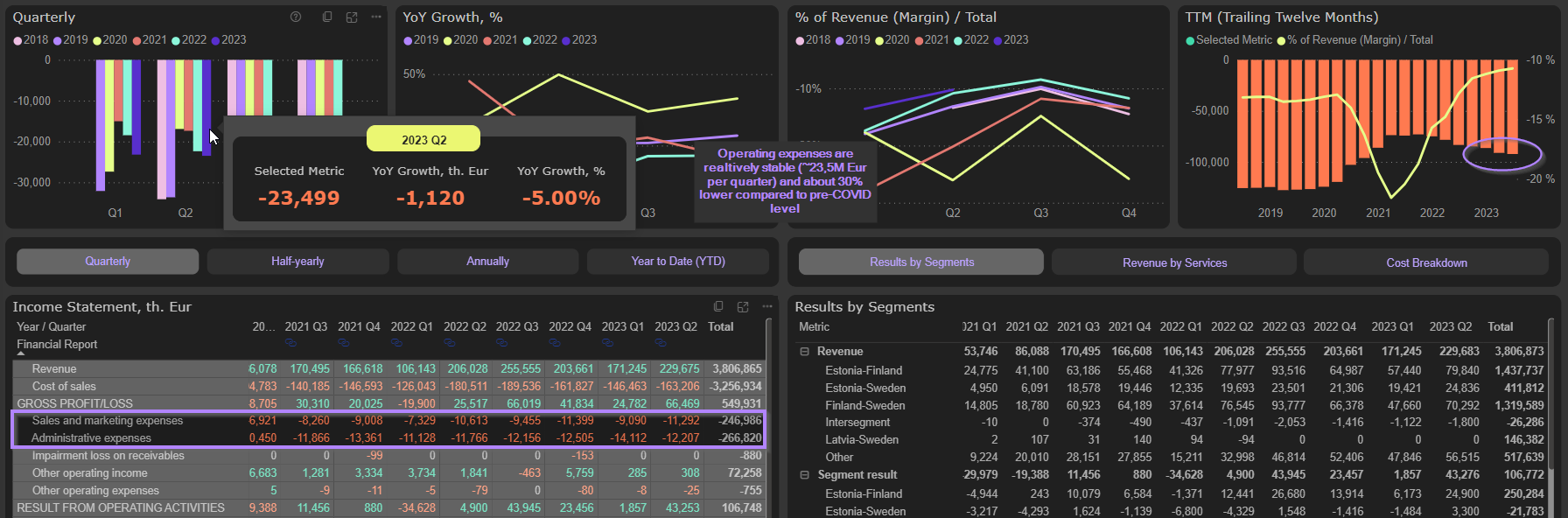 Even stronger performance is on the operating level. Operating expenses are relatively stable (~23,5M Eur in 2023 Q2) and 30% lower, compared to pre-COVID level (main contributor to lower OpEx is S&M expenses):
