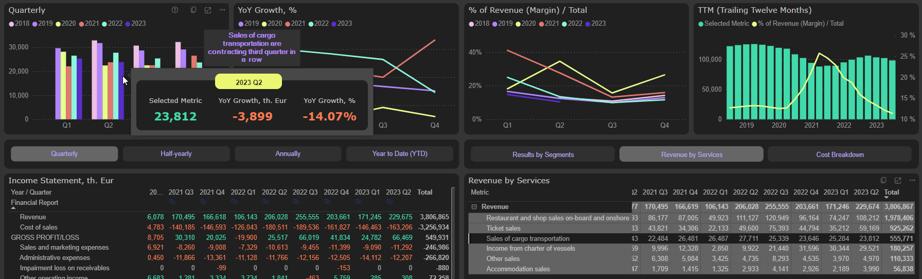 Sales of cargo transportation are contracting third quarter in a row. In 2023 Q2 sales dropped 14% YoY and were 25% lower compared to pre-COVID level: