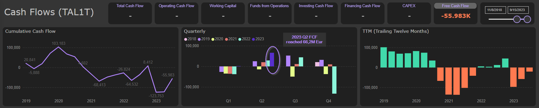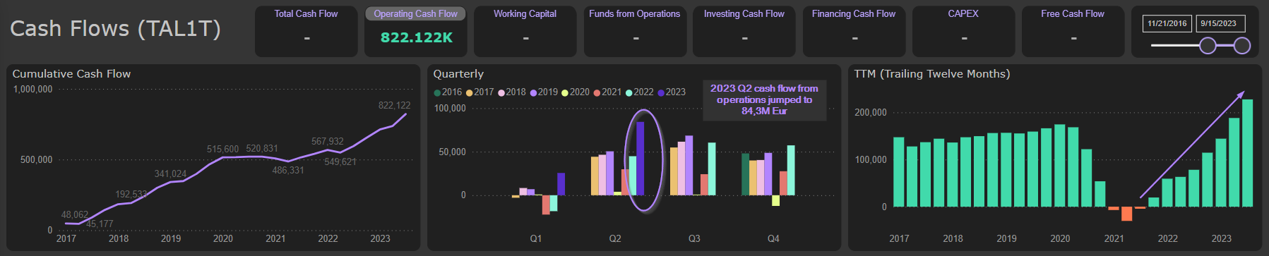 So far, flexibility added by chartering of vessels allows company to enjoy excellent operating results and huge cash flows. 2023 Q2 cash flow from operations jumped to eye-popping 84,3M Eur, supported by record FFO and inflows from decreased Working capital: