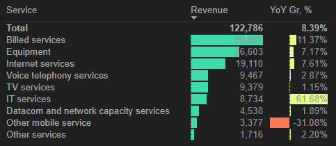 2023 Q3 revenue grew by 8,4% YoY to 122,8M Eur, driven mostly by mobile billed services, equipment, internet services and IT services: