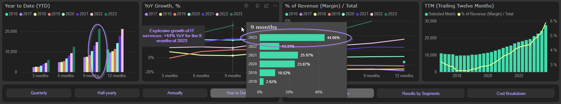 IT services “exploded” by +62% YoY in 2023 Q3 and +44% YoY for the 9 months, reaching almost 6% of total revenue: