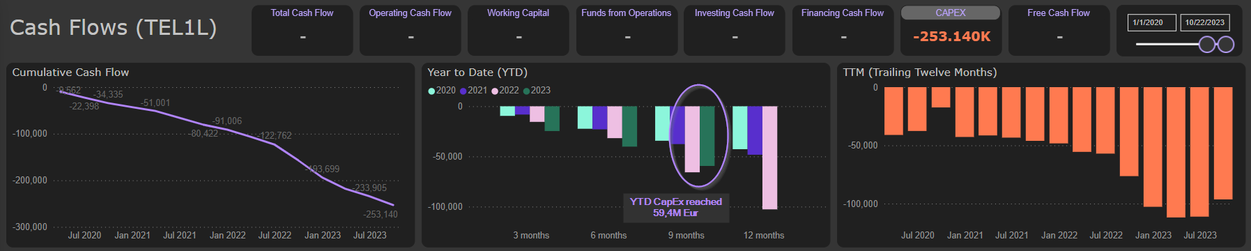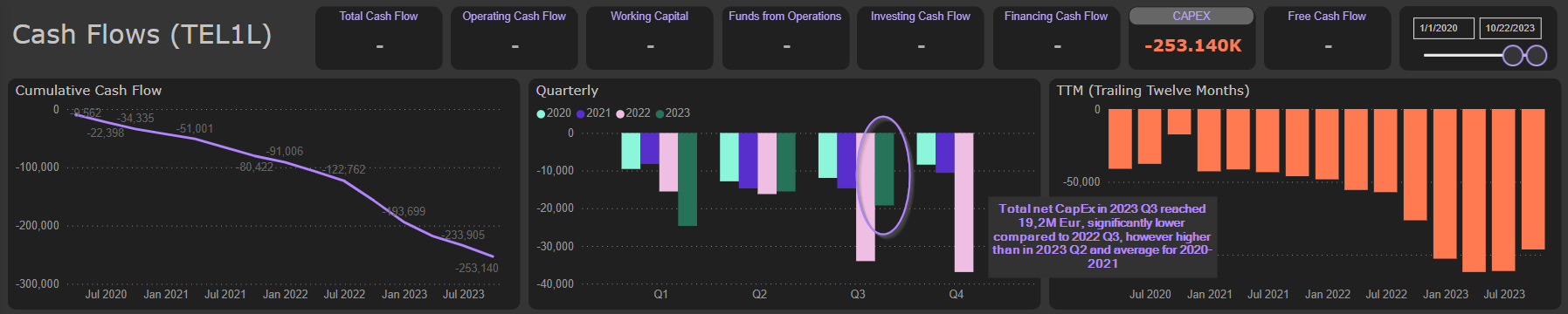 On the CapEx front also is significant progress, though not so excellent, compared to operating activities. Total net CapEx in 2023 Q3 reached 19,2M Eur, significantly lower compared to 2022 Q3, however higher than in 2023 Q2 and average for 2020-2021: