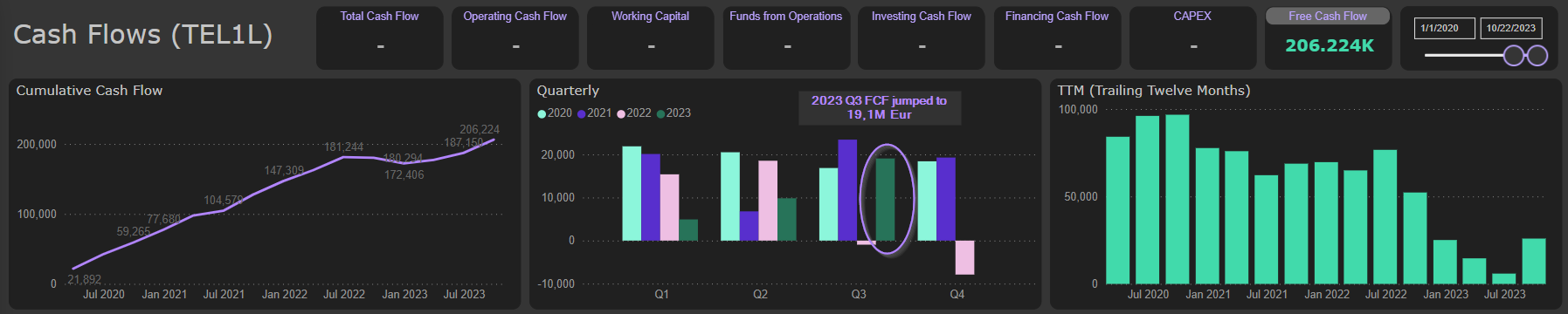 Due to higher cash flow from operations and lower CapEx, 2023 Q3 FCF jumped to 19,1M Eur (In calculating FCF we subtract also lease payments to restore cash flow comparability after IFRS 16 changes in 2019. Without lease payment subtraction 2023 Q3 FCF reached 23,1M Eur):