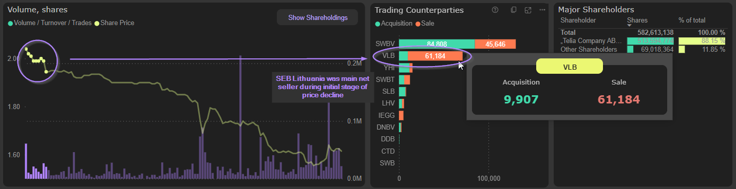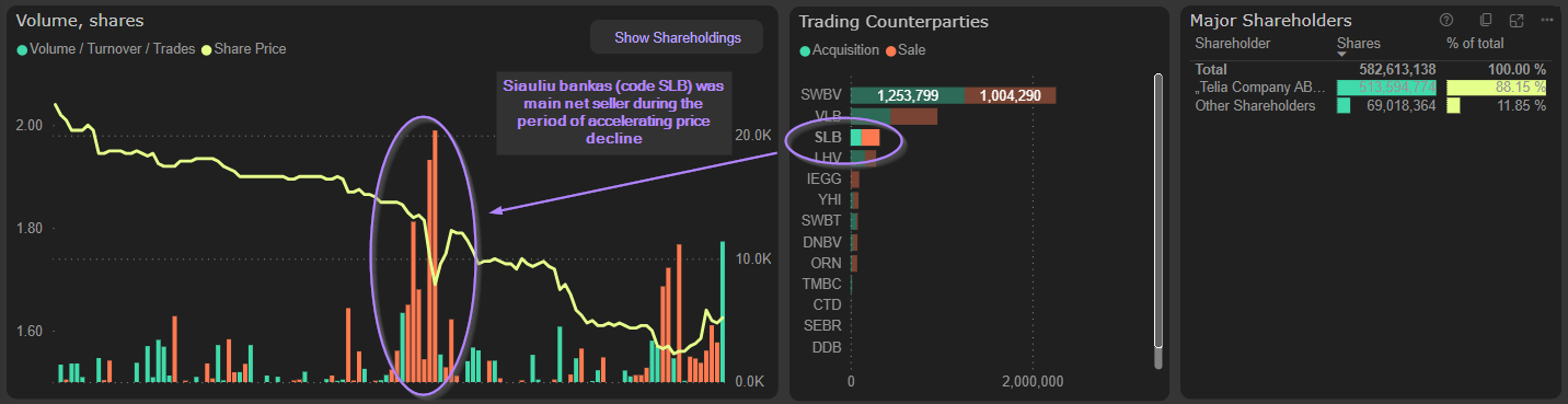 Analysis of the Nasdaq Vilnius brokers’ trading activity during this period may suggest increased selling pressure from the institutional investors’ side. E.g., during initial stage of the price decline SEB Lithuania (code VLB) was the main net seller with average trade size significantly above average. That may indicate increased selling activities of SEB Investment Management managed funds. Meanwhile, during the period of accelerated price decline (beginning of the August 2023) Siauliu bankas (code SLB) was the main net seller, which may indicate increased selling activities of INVL Asset Management managed funds: